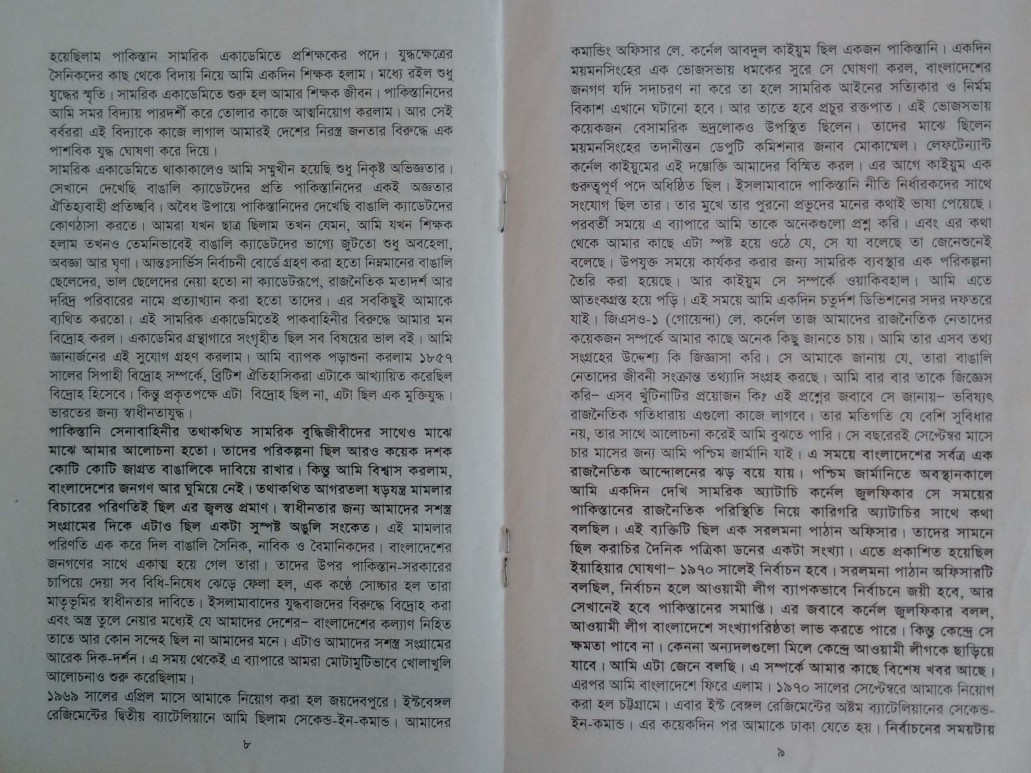 ভারত-পাকিস্তান যুদ্ধ আত্মবিশ্বাস জাগিয়েছিল আমাদের মনে। বাঙালি সৈনিকদের মনে। বিমানবাহিনীর বাঙালি জওয়ানদের মনে। আমরা তখনই বুঝেছিলাম, বিশ্বের যেকোনো বাহিনীর মোকাবিলাই আমরা সক্ষম। জানুয়ারি মাসে আমি নিযুক্ত হয়েছিলাম পাকিস্তান সামরিক একাডেমিতে প্রশিক্ষকের পদে। যুদ্ধক্ষেত্রে সৈনিকদের কাছ থেকে বিদায় নিয়ে আমি একদিন শিক্ষক হলাম। মনে রইলো শুধু যুদ্ধের স্মৃতি। সামরিক একাডেমিতে শুরু হলো আমার শিক্ষক জীবন। পাকিস্তানিদের আমি সমরবিদ্যায় পারদর্শী করে তোলার কাজে আত্মনিয়োগ করলাম। আর সেই বর্বররা এই বিদ্যাকে কাজে লাগালো আমারই দেশের নিরস্ত্র জনতার বিরুদ্ধে এক পাশবিক যুদ্ধ ঘোষণা করে দিয়ে।সামরিক একাডেমিতে থাকাকালে আমি সম্মুখীন হয়েছি শুধু নিকৃষ্ট অভিজ্ঞতার। সেখানে দেখেছি বাঙালি ক্যাডেটদের প্রতি পাকিস্তানিদের একই অজ্ঞতার ঐতিহ্যবাহী প্রতিচ্ছবি। অবৈধ উপায়ে পাকিস্তানিদের দেখেছি বাঙালি ক্যাডেটদের কোণঠাসা করতে। আমরা যখন ছাত্র ছিলাম তখন যেমন, আমি যখন শিক্ষক হলাম তখনো তেমনিভাবেই বাঙালি ক্যাডেটদের ভাগ্যে জুটতো শুধু অবহেলা, অবজ্ঞা আর ঘৃণা। আন্তঃসার্ভিস নির্বাচনী বোর্ডে গ্রহণ করা হতো নিম্নমানের বাঙালি ছেলেদের, ভালো ছেলেদের নেওয়া হতো না ক্যাডেটরূপে। রাজনৈতিক মতাদর্শ আর দরিদ্র পরিবারের নামে প্রত্যাখ্যান করা হতো তাদের। এর সবকিছুই আমাকে ব্যথিত করতো। এই সামরিক একাডেমিতেই পাকবাহিনীর বিরুদ্ধে আমার মন বিদ্রোহ করলো। একাডেমির গ্রন্থাগারে সংগৃহিত ছিল সব বিষয়ের ভালো ভালো বই। আমি জ্ঞানার্জনের এই সুযোগ গ্রহণ করলাম। আমি ব্যাপক পড়াশোনা করলাম ১৮৫৭ সালের সিপাহী বিদ্রোহ সম্পর্কে, বৃটিশ ঐতিহাসিকরা এটাকে আখ্যায়িত করেছিল বিদ্রোহ হিসেবে। কিন্তু প্রকৃতপক্ষে এটা বিদ্রোহ ছিল না, এটা ছিল এক মুক্তিযুদ্ধ। ভারতের জন্যে স্বাধীনতার যুদ্ধ।