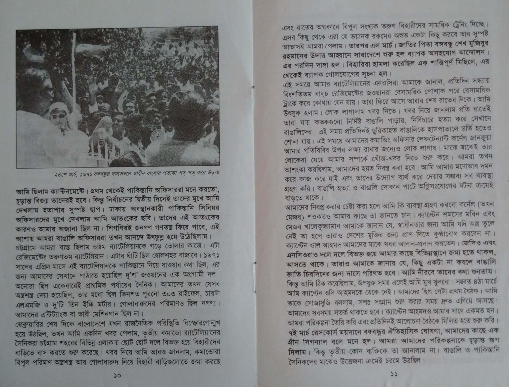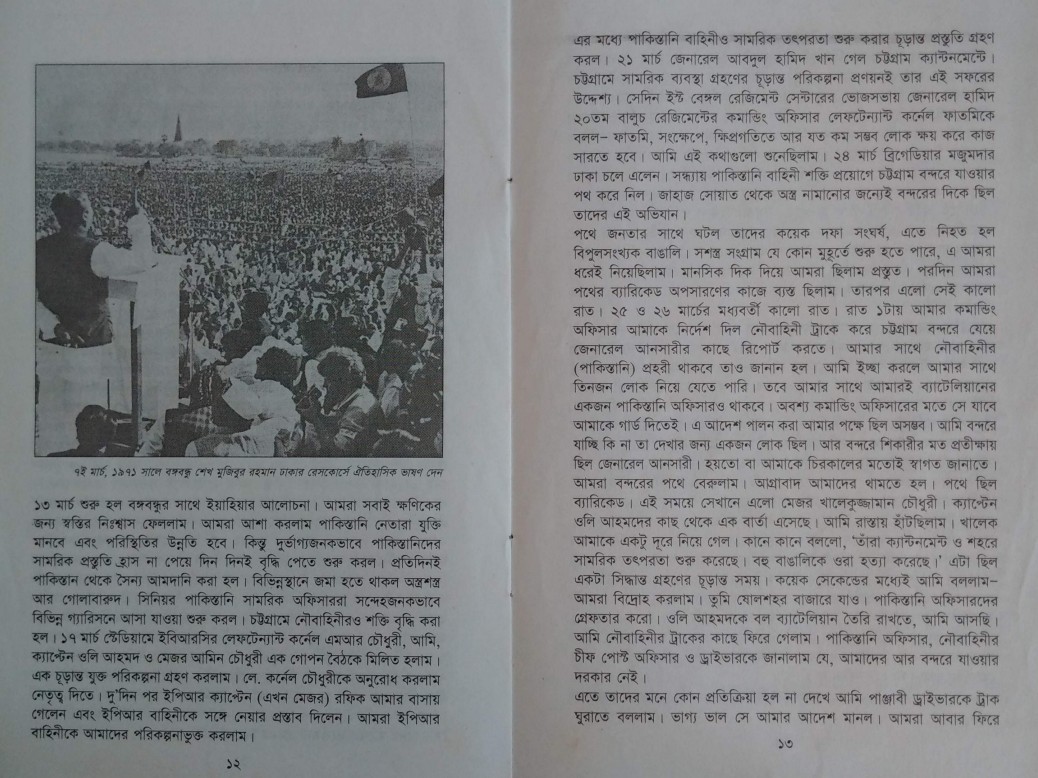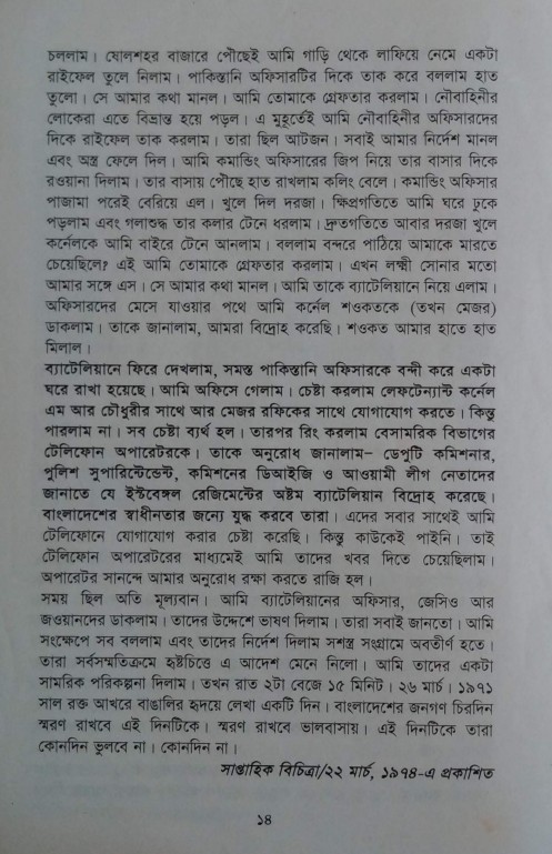 ব্যাটেলিয়নে ফিরে দেখলাম, সমস্ত পাকিস্তানি অফিসারকে বন্দী করে একটা ঘরে রাখা হয়েছে। আমি অফিসে গেলাম। চেষ্টা করলাম লেফটেন্যান্ট কর্নেল এম আর চৌধুরীর সাথে আর মেজর রফিকের সাথে যোগাযোগ করতে। কিন্তু পারলাম না। সব চেষ্টা ব্যর্থ হলো। তারপর রিং করলাম বেসামরিক বিভাগের টেলিফোন অপারেটরকে। তাকে অনুরোধ জানালাম, ডেপুটি কমিশনার, পুলিশ সুপারিনটেনডেন্ট, কমিশনার, ডিআইজি ও আওয়ামী লীগ নেতাদের জানাতে যে ইস্টবেঙ্গল রেজিমেন্টের অস্টম ব্যাটেলিয়ন বিদ্রোহ করেছে। বাংলাদেশের স্বাধীনতার জন্য যুদ্ধ করবে তারা। এদের সবার সাথেই আমি টেলিফোনে যোগাযোগ করার চেষ্টা করেছি। কিন্তু কাউকেই পাইনি। তাই টেলিফোন অপারেটরের মাধ্যমেই আমি তাদের খবর দিতে চেয়েছিলাম। অপারেটর সানন্দে আমার অনুরোধ রক্ষা করতে রাজি হলো।সময় ছিল অতি মূল্যবান। আমি ব্যাটেলিয়নের অফিসার, জেসিও, আর জওয়ানদের ডাকলাম। তাদের উদ্দেশ্যে ভাষণ দিলাম। তারা সবই জানতো। আমি সংক্ষেপে সব বললাম এবং তাদের নির্দেশ দিলাম সশস্ত্র সংগ্রামে অবতীর্ণ হতে। তারা সর্বসম্মতিক্রমে হৃষ্টচিত্তে এ আদেশ মেনে নিলো। আমি তাদের একটা সামরিক পরিকল্পনা দিলাম। তখন রাত ২টা বেজে ১৫ মিনিট। ২৬ শে মার্চ। ১৯৭১ সাল। রক্ত অক্ষরে বাঙালির হৃদয়ে লেখা একটি দিন। বাংলাদেশের জনগণ চিরদিন স্মরণ রাখবে এই দিনটিকে। স্মরণ রাখতে ভালোবাসবে। এই দিনটিকে তারা কোনোদিন ভুলবে না। কো-নো-দি-ন না।”