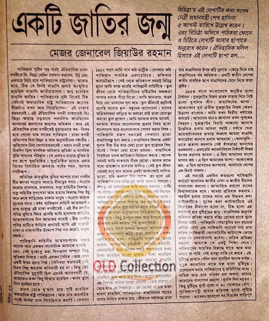 বাংলাদেশ সেনাবাহিনীর তদানীন্তন উপপ্রধান মেজর জেনারেল জিয়াউর রহমান, বীর উত্তম-এর লেখা ‘একটি জাতির জন্ম’ প্রবন্ধটি দৈনিক বাংলায় ১৯৭২ সালের ২৬ মার্চ সংখ্যায় প্রথম প্রকাশিত হয়। ১৯৭৪ সালের ২৬ মার্চ অধুনালুপ্ত সাপ্তাহিক পত্রিকা ‘বিচিত্রা’য় পুনঃ প্রকাশিত হয়েছিল।