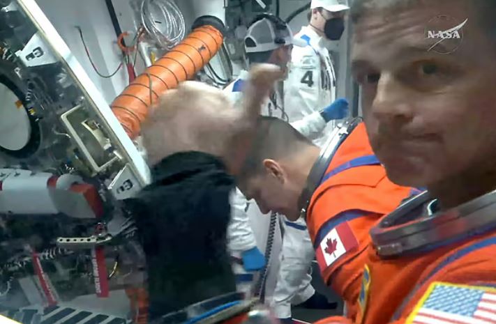 ওরিয়ন ক্রু ক্যাপসুলে প্রবেশের ঠিক আগে কমান্ডার রিড ওয়াইজম্যান, পাশে কানাডিয়ান স্পেস এজেন্সির নভোচারী জেরেমি হ্যানসেন