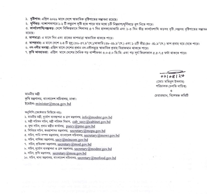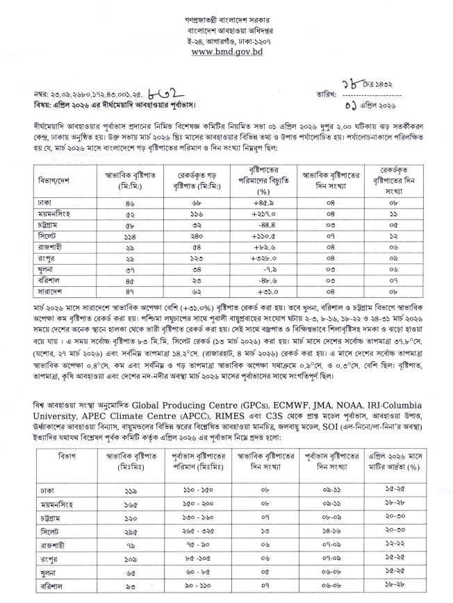 বৃহস্পতিবার (২ এপ্রিল) আবহাওয়া অধিদপ্তরের এপ্রিল মাসব্যাপী পূর্বাভাসে এ তথ্য জানানো হয়েছে।