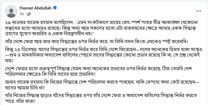 হাসনাত আব্দুল্লাহ আরও প্রশ্ন তুলেছেন, ‘দেশে ফেরার মতো গুরুত্বপূর্ণ সিদ্ধান্ত যেমন অন্য অনেকের প্রভাবের ওপর নির্ভর করেছে, ঠিক তেমনি দেশ পরিচালনার ক্ষেত্রেও কি তিনি তাদের দ্বারা প্রভাবিত?’