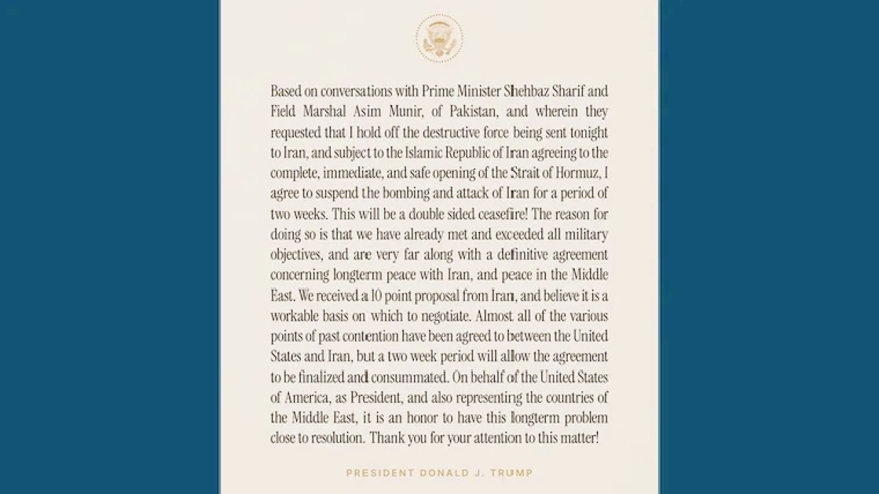 একে একটি ‘দ্বিমুখী যুদ্ধবিরতি’ হিসেবে অভিহিত করে তিনি বলেন, "আমি দুই সপ্তাহের জন্য ইরানে বোমাবর্ষণ এবং হামলা স্থগিত রাখতে সম্মত হয়েছি। এটি হবে একটি দ্বিমুখী যুদ্ধবিরতি!"