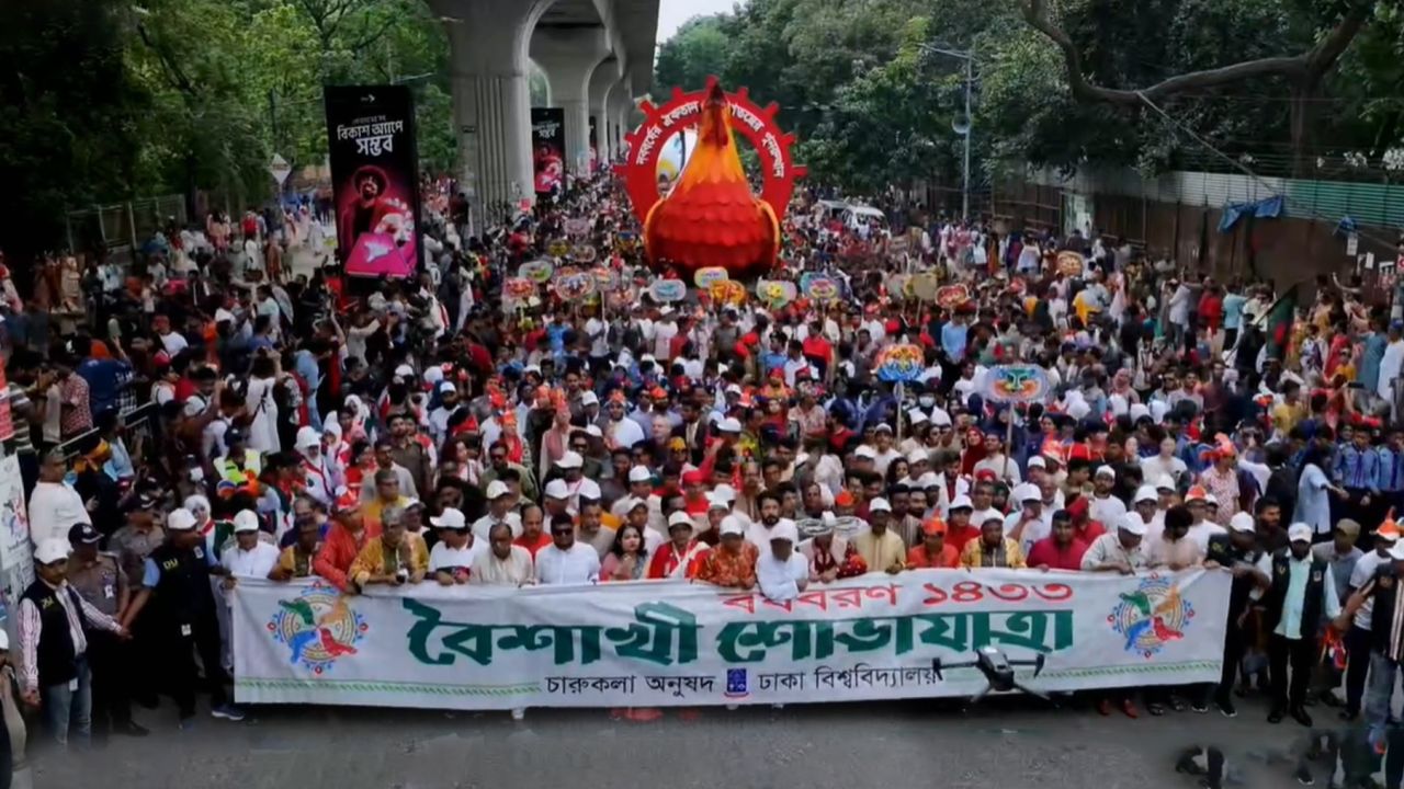 নতুন বছর ১৪৩৩ বঙ্গাব্দের প্রথম প্রভাতে ‘নববর্ষের ঐকতান, গণতন্ত্রের পুনরুত্থান’ এই মূলমন্ত্রকে সামনে রেখে ঢাকা বিশ্ববিদ্যালয়ের চারুকলা অনুষদ থেকে বের হয়েছে বর্ণাঢ্য ‘বৈশাখী শোভাযাত্রা’। আজ মঙ্গলবার (১৪ এপ্রিল) সকাল ৯টায় জাতীয় সংগীত পরিবেশনের মাধ্যমে এই মঙ্গলযাত্রার সূচনা হয়।