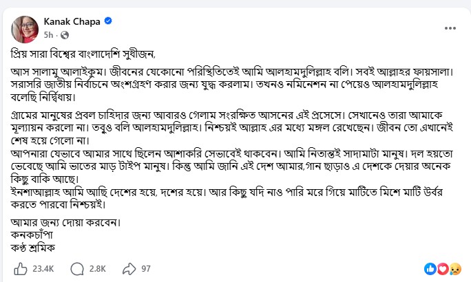 ভক্ত-অনুরাগীদের উদ্দেশে কনকচাঁপা লেখেন, ‘আপনারা যেভাবে আমার সঙ্গে ছিলেন, আশা করি সেভাবেই থাকবেন। আমি নিতান্তই সাদামাটা মানুষ। দল হয়তো ভেবেছে আমি ভাতের মাড় টাইপ মানুষ। কিন্তু আমি জানি এই দেশ আমার, গান ছাড়াও এ দেশকে দেয়ার অনেক কিছু বাকি আছে।’