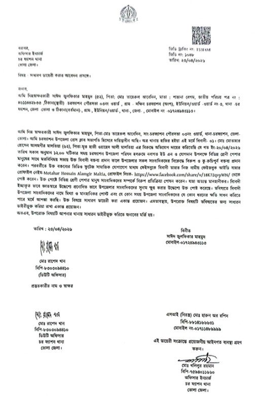 চরফ্যাশন থানার ভারপ্রাপ্ত কর্মকর্তা (ওসি) খলিলুর রহমান জানান, ‘প্রেসক্লাব সভাপতির অভিযোগটি সাধারণ ডায়েরি হিসেবে নথিভুক্ত করা হয়েছে। পুরো বিষয়টি খতিয়ে দেখা হচ্ছে। তদন্ত শেষে প্রয়োজনীয় আইনি পদক্ষেপ নেওয়া হবে।