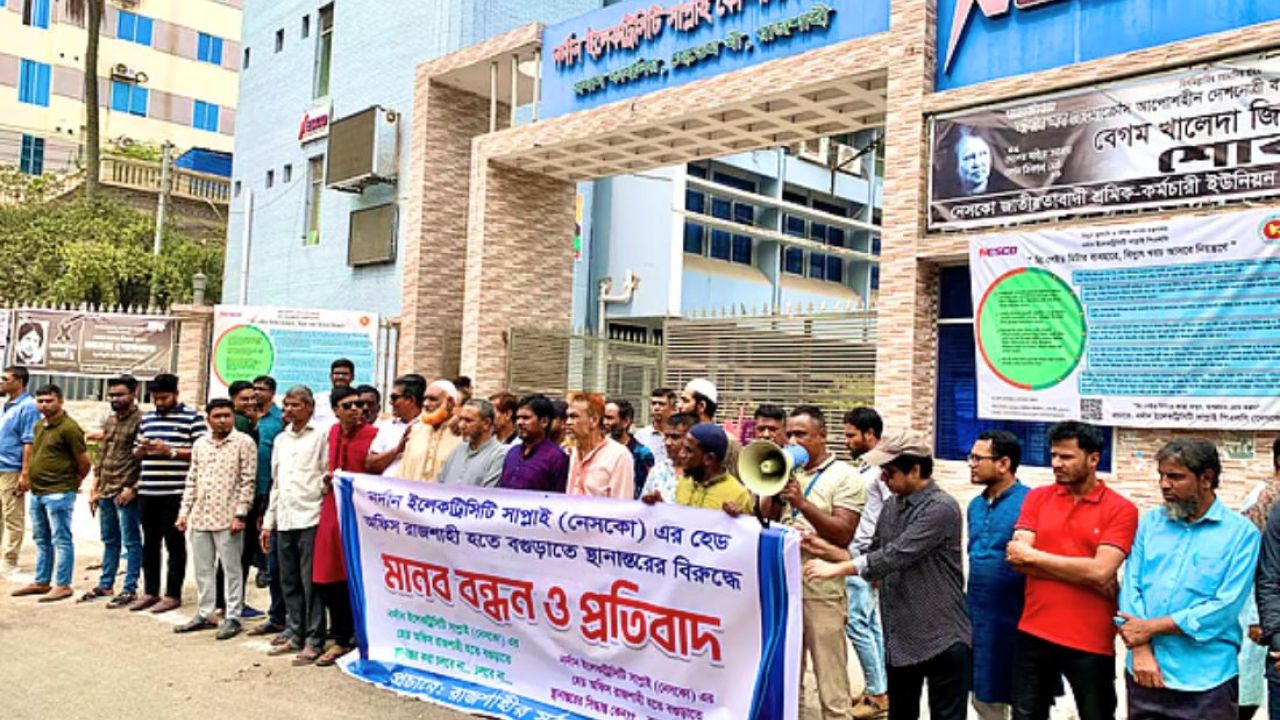রাজশাহী থেকে নর্দান ইলেকট্রিসিটি সাপ্লাই কোম্পানির (নেসকো) প্রধান কার্যালয় বগুড়ায় স্থানান্তরের প্রস্তাবের প্রতিবাদে মানববন্ধন অনুষ্ঠিত হয়েছে।
