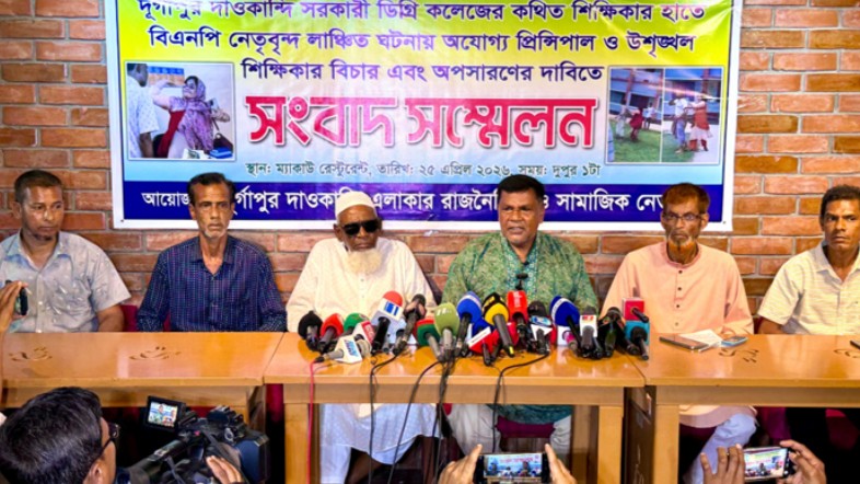 সংবাদ সম্মেলনে শিক্ষিকা ও অধ্যক্ষের অপসারণ দাবি করেন বিএনপির নেতারা।