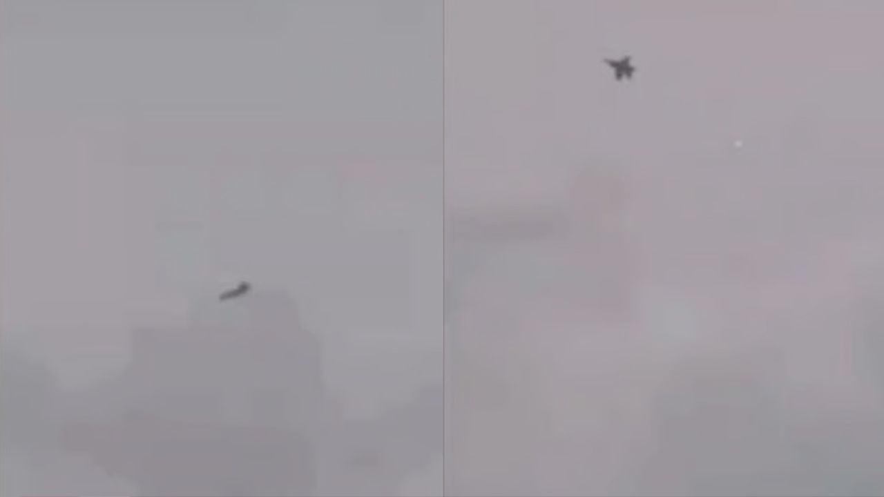 একটি যুদ্ধবিমানের কাছে হঠাৎ বিস্ফোরণের ঝলক দেখা যাচ্ছে এবং বিমানটি ধোঁয়া ছেড়ে ভারসাম্য